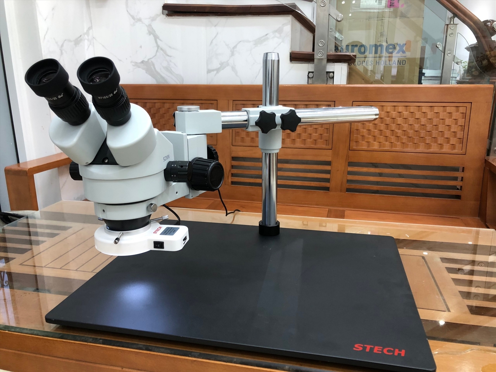 - Kính hiển vi SZM7045-SERIES có trường làm việc lớn và diện tích quan sát được dưới kính khá rộng, có thể soi nhìn thấy hết bản mạch khi sử dụng kèm lens zoom chuyên dụng.
